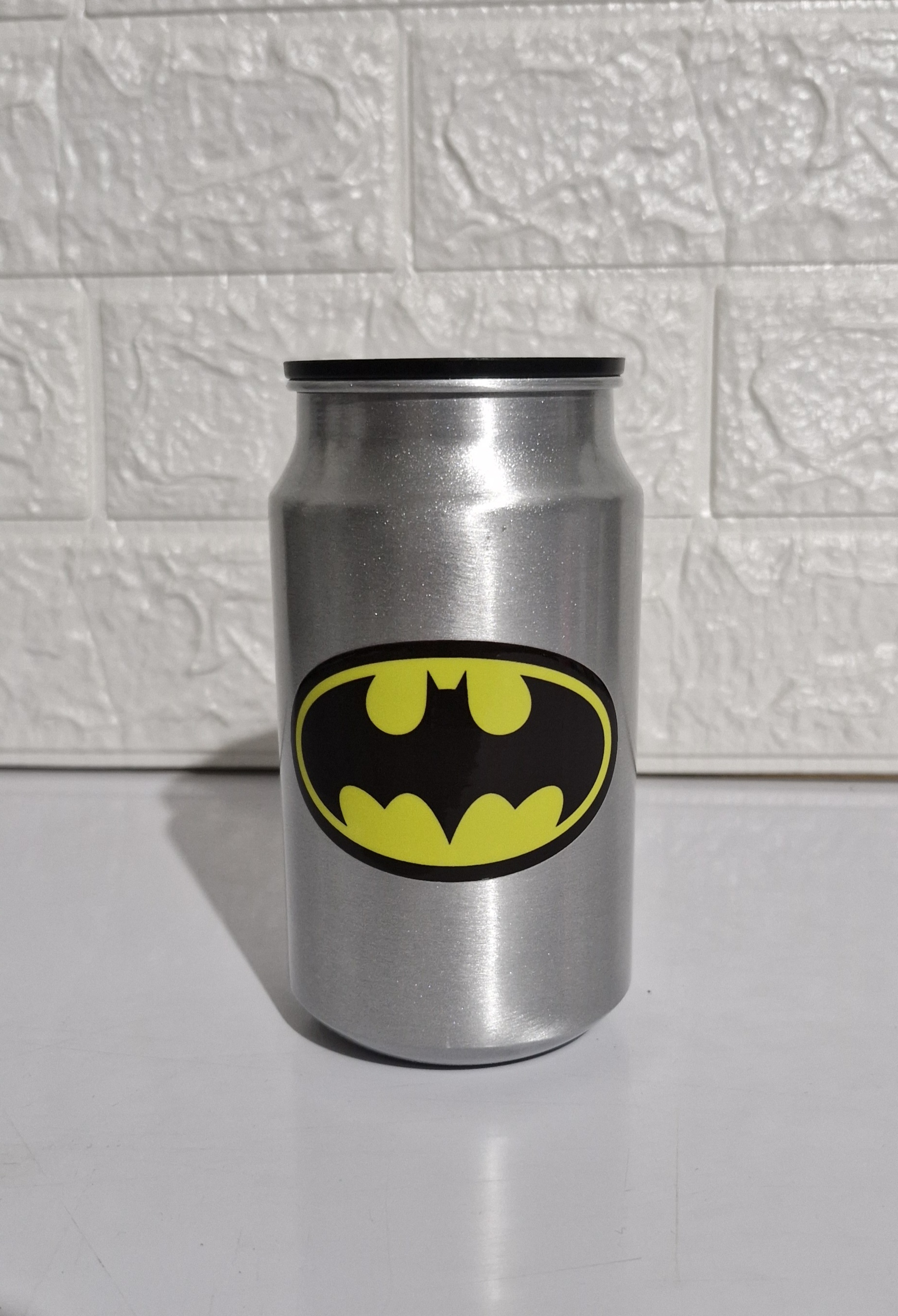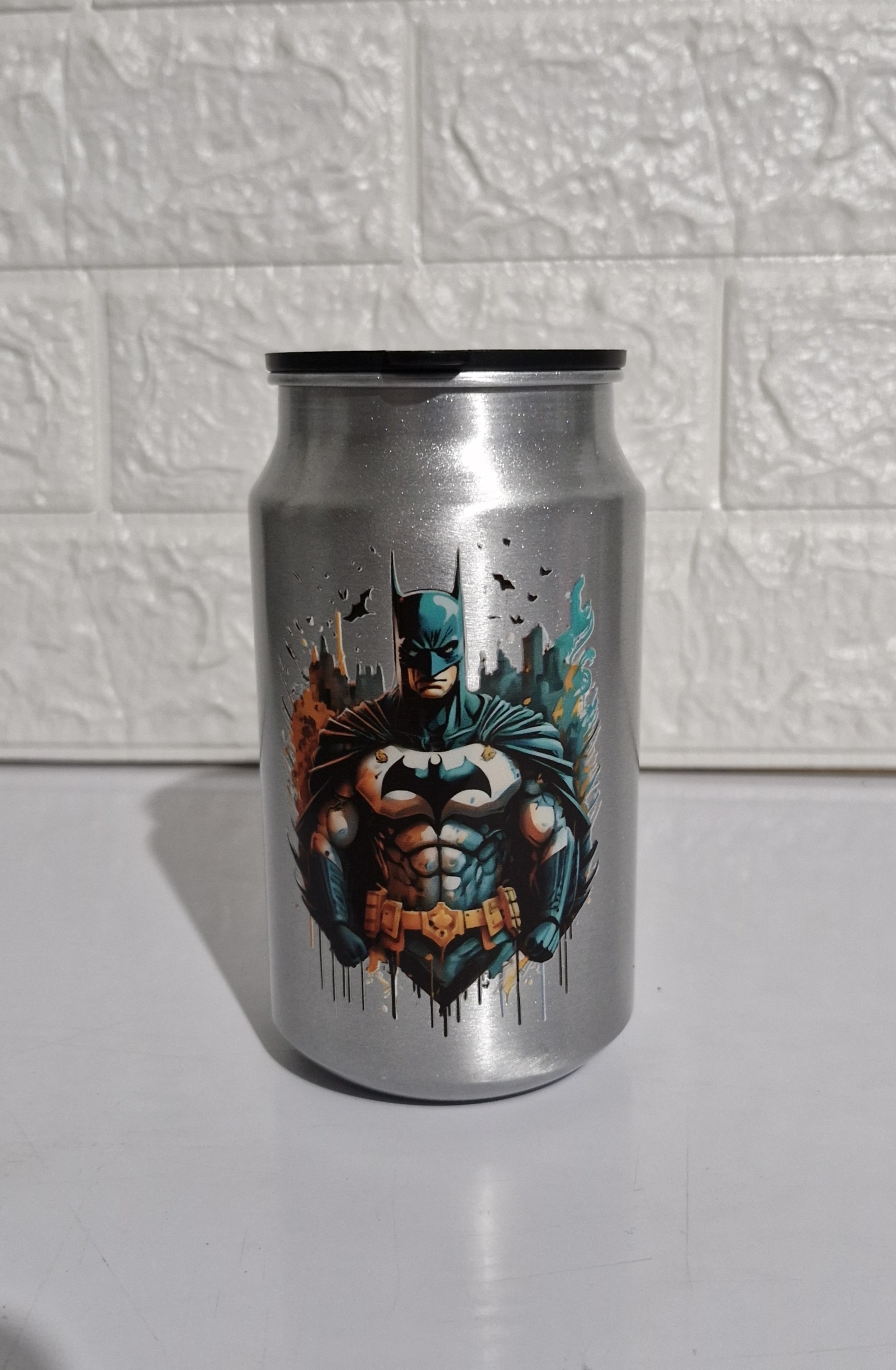 Lata Metálica Batman $120.00 Caracteristicas Capacidad 300 ml Aluminio Ideal para Bebidas Frias Personalizado en DTF de Alta calidad Termos Inicio